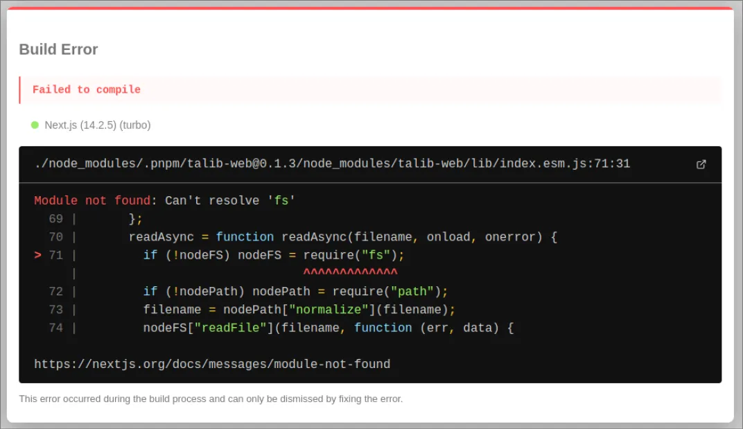 Problem Description When running Trade-X charts in a Next.js application with Turbopack, the build process fails due to attempts to bundle the fs module, which is not available in the browser environment. This issue does not occur when using Webpack, as Webpack allows developers to specify certain modules to be ignored on the client side through the package.json file: